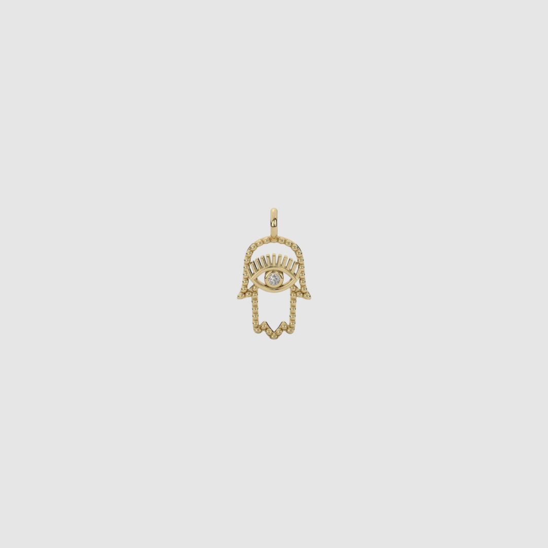 Handgefertigtes Charm in Form einer Hand der Fatima aus 925er Silber, wahlweise in goldplattierter Ausführung.