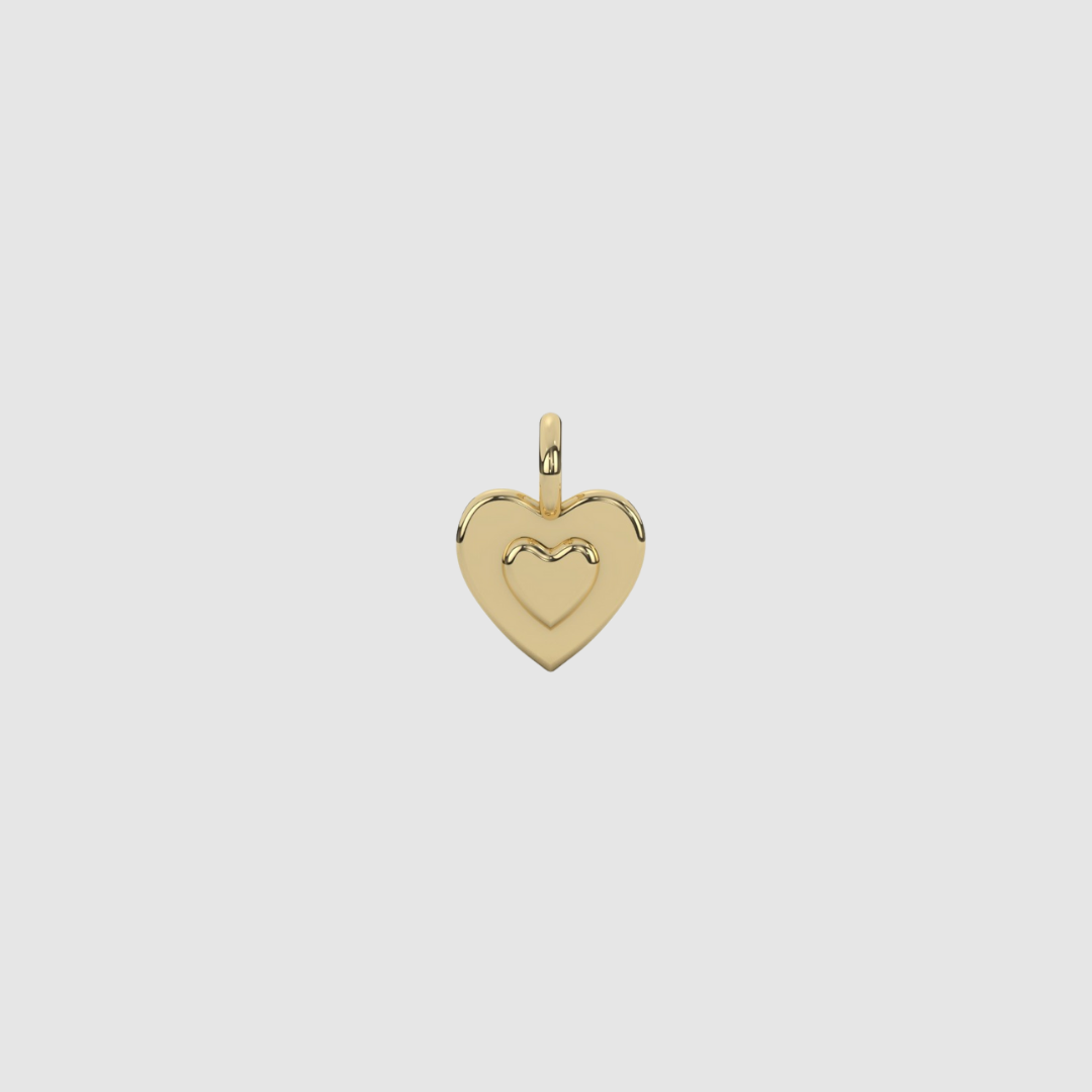 Handgefertigtes Charm in Form eines kleinen Herzens in einem großen Herz aus 925er Silber, wahlweise in goldplattierter Ausführung.
