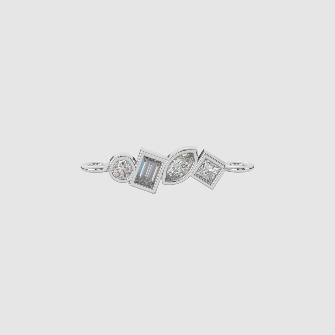 Inspiriert vom Sternbild der Leier, steht der Verbindungscharm Lyra für Harmonie, Kreativität und Ästhetik. Die Kombination unterschiedlicher Schliffarten rund, baguette und marquise erzeugt ein feines Zusammenspiel von Formen und Lichtreflexen, das an eine kleine Konstellation erinnert.
