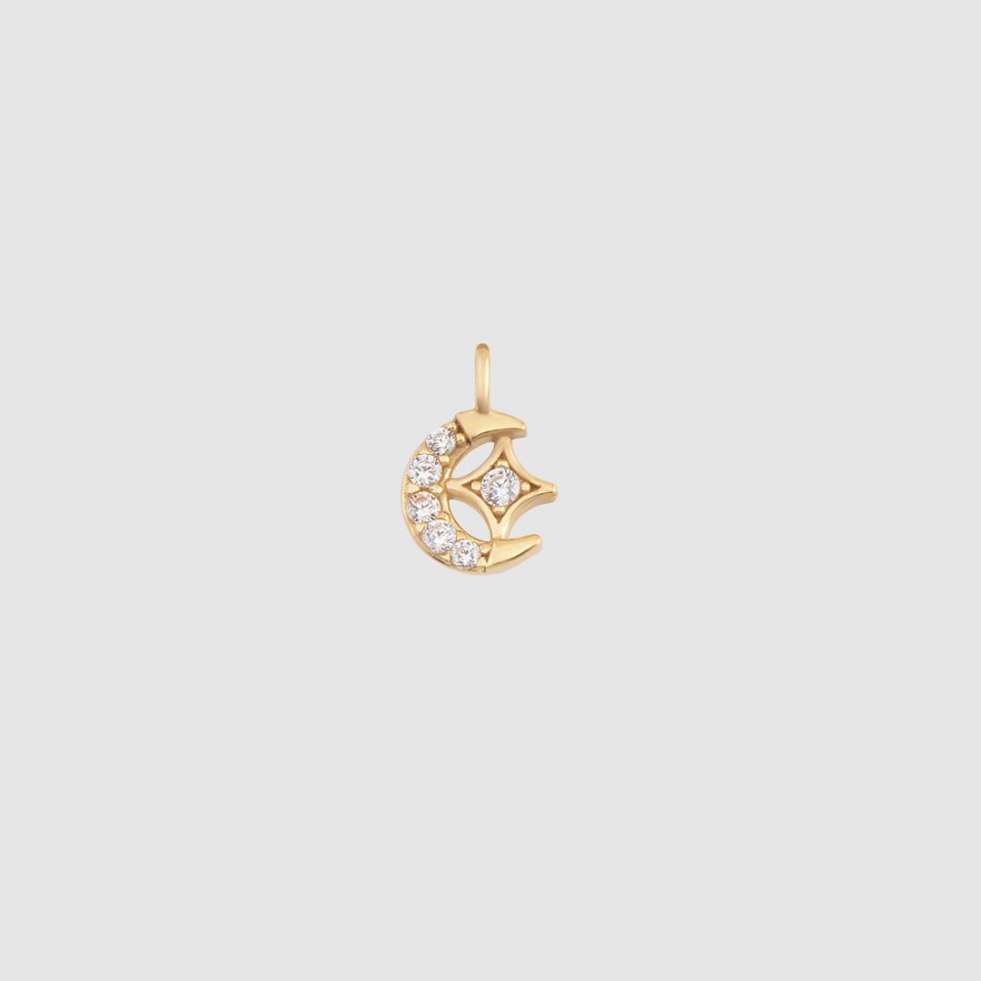 Handgefertigtes Charm in Form eines Monds mit Sternchen aus 925er Silber, wahlweise in goldplattierter Ausführung.